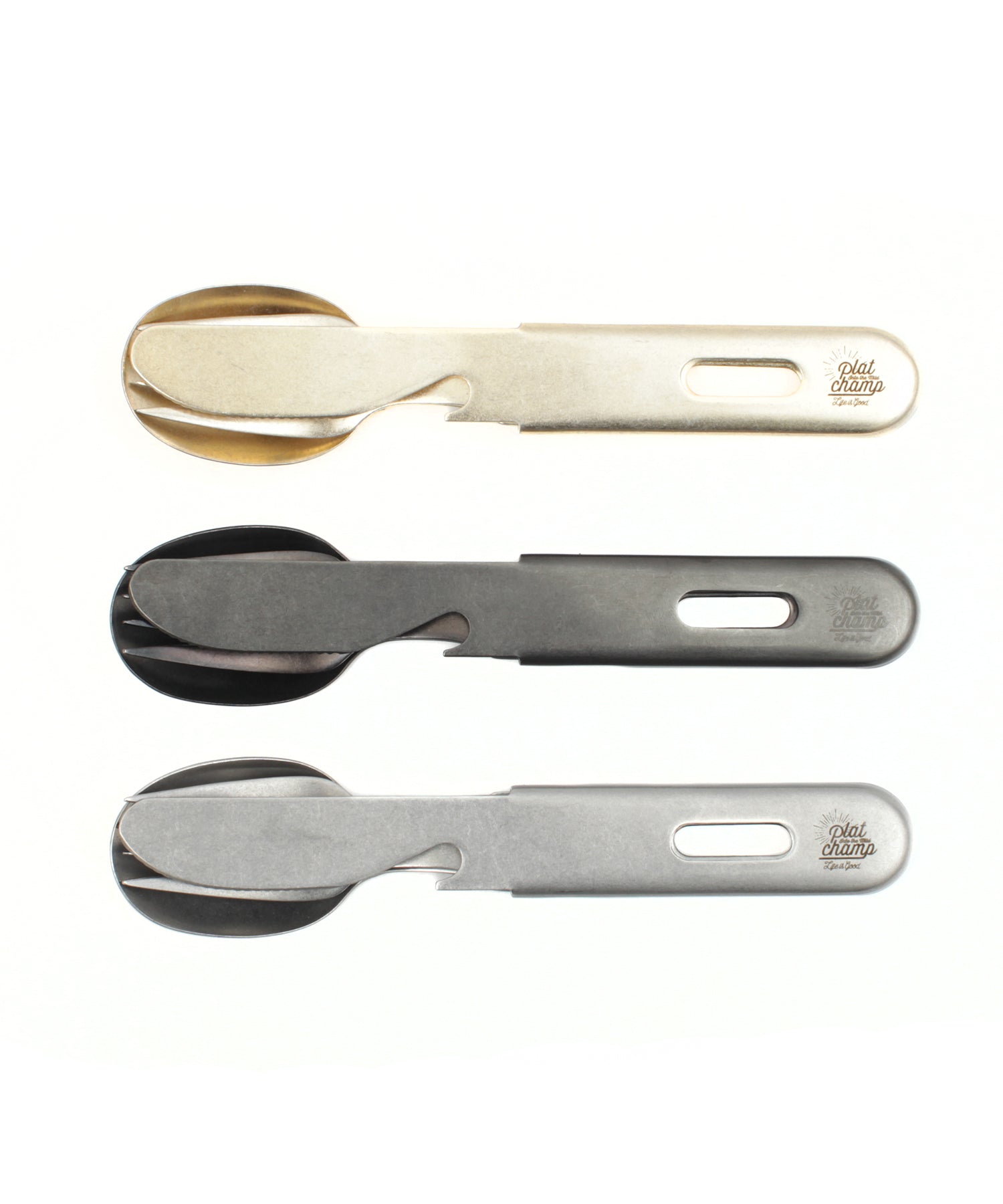 最初は硬めなのだが、慣れればスムーズにスタッキングして収納することができる。ちょうどいいコンパクトさと重さがたまらない。フックに吊り下げることも可能。とにかくカトラリーでは俺の中ではダントツに使いやすくカッコいいのだ。これさえあれば大袈裟なカトラリーセットは不要。どこにでも持っていけるだろう。3種類あるカラーバリエーションの中で俺たちはシルバーを選択したが、ブラックも魅力的だ。ブラックは『黒色酸化発色』という技術を使って独特の黒色発色しているようだ。塗料などで着色していないので、使っていくうちに、よりカッコいいエイジング変化が楽しめるかもしれない。