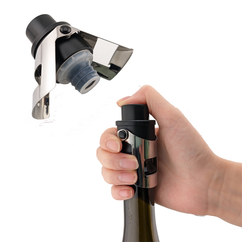 シリコン部分を瓶に差し込み、ステンレスのストッパーを閉じて瓶の突起部分に引っ掛けてロックする感じ。最初は扱いにちょっと戸惑ったが、コツを掴めばストッパーもカチッと引っかかりしっかりとロックされる。「エアープレス シャンパンストッパー」自体を瓶に押し込みながらグッと軽く握る感じでストッパーを閉じると、カチッと瓶の突起部分にハマってくれる。