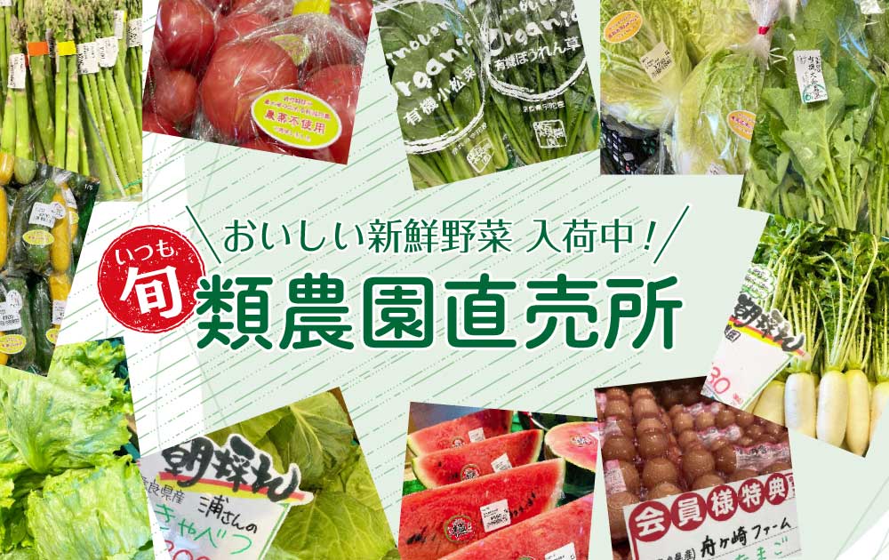 「類農園直売所 彩都店」は朝どれ野菜なんかも並ぶ直売所。無農薬の野菜たちもあるし、こだわりのあるお店なのだ。